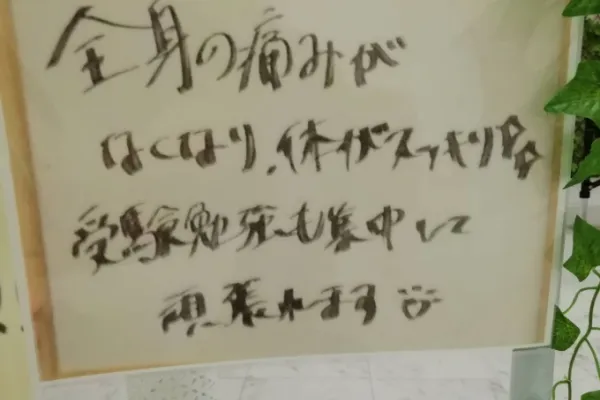 腰痛・肩こり・膝関節痛・交通事故施術・坐骨神経痛・産後骨盤矯正など、 どんな症状でも“原因を見極め、改善へ導ける経験と技術”があります。 延べ1万人以上の施術実績と触診力で、あなたに最適な施術を行います。
